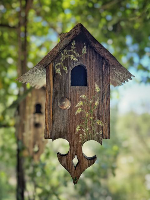 Una pequeña y dulce casita para dar hogar a las aves que viven en nuestro jardin. Realizada en madera y con techo de metal. Le sumamos el detalle de la pintura a mano en su frente.