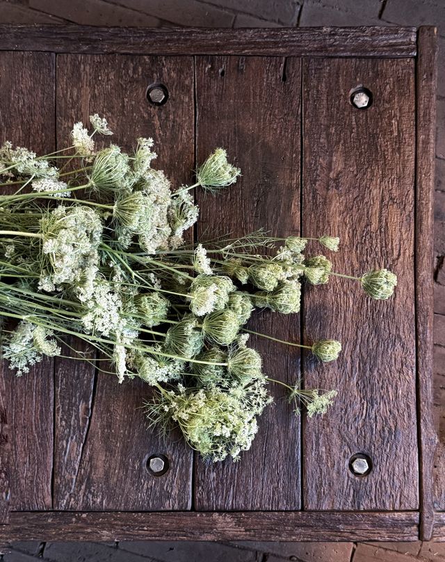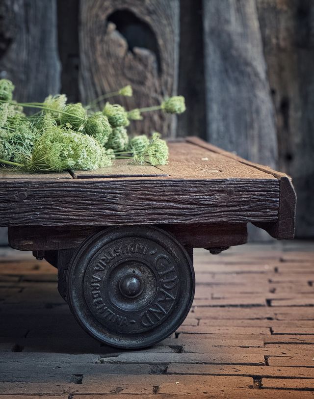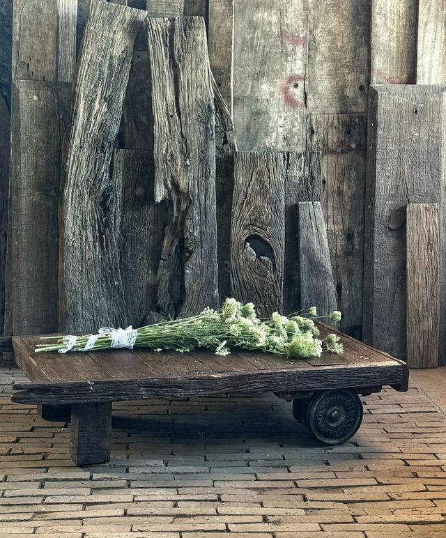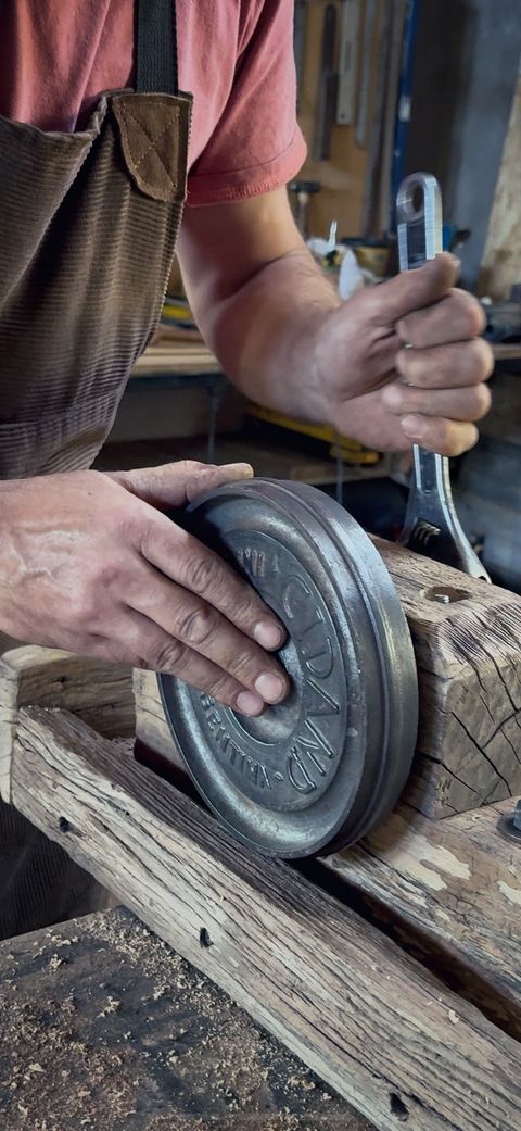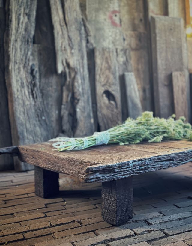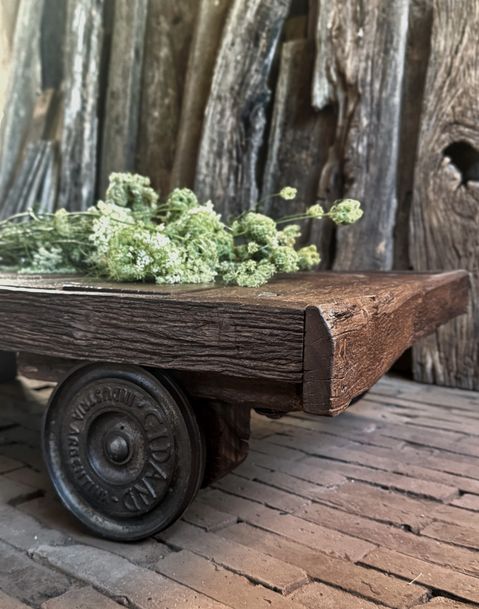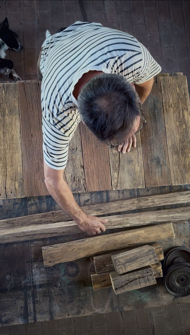 Con tablas de madera antiguas de Lapacho, Julio las unió y les dió un borde con viejas varillas de alambrado. dejando su terminación tallada por el tiempo, por las lluvias y el viento de los campos de nuestra pampa Argentina. En un extremo le sumo dos ruedas antiguas de máquina de cortar césped, donde se aprecia las inscripciones en el hierro forjado .