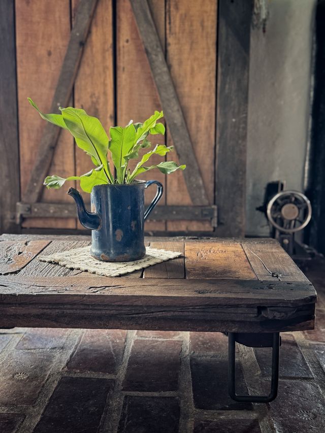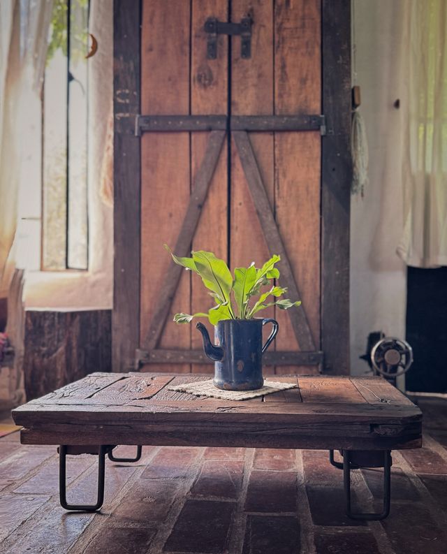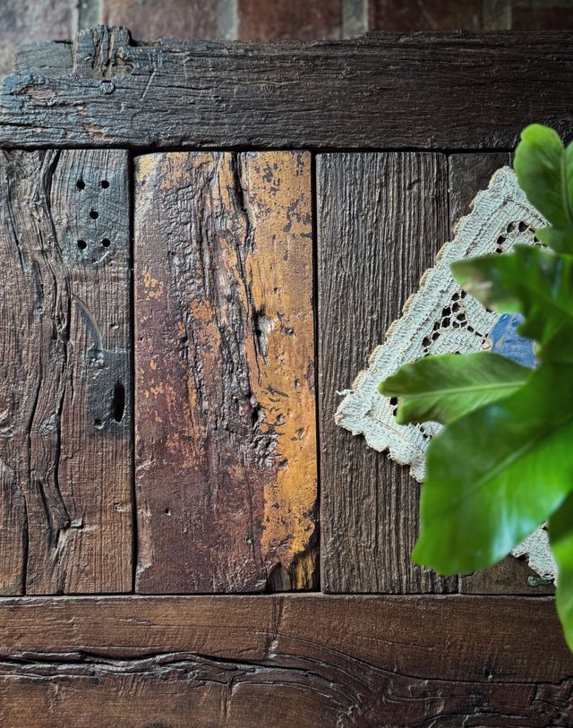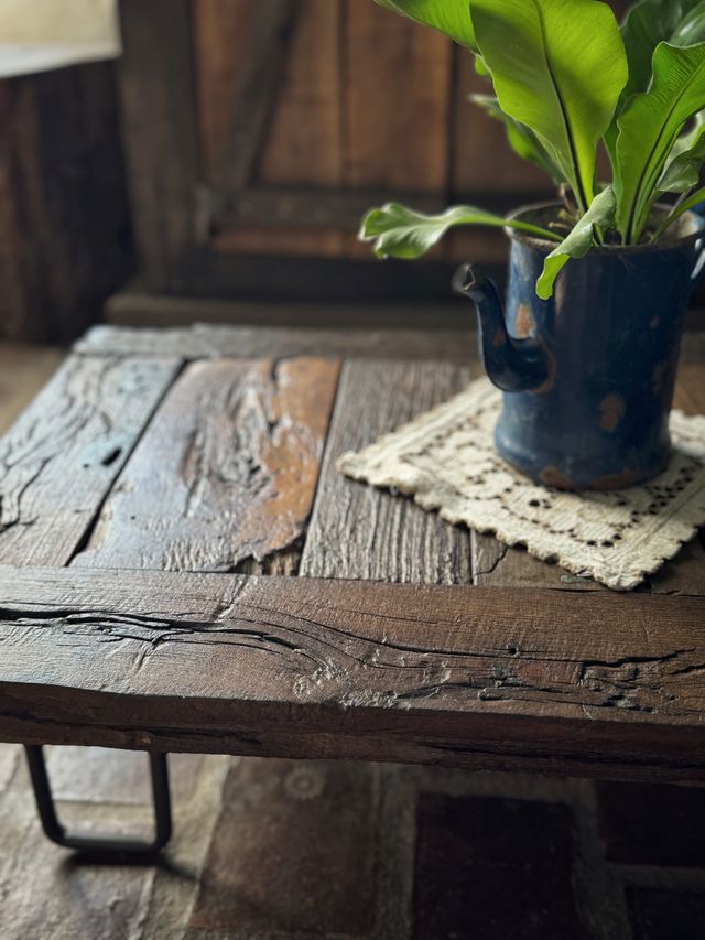En esta mesa se unieron maderas en diferentes tonos y lugares, son partes de puertas antiguas, donde Julio las unio y les dio nueva vida realizando este producto.